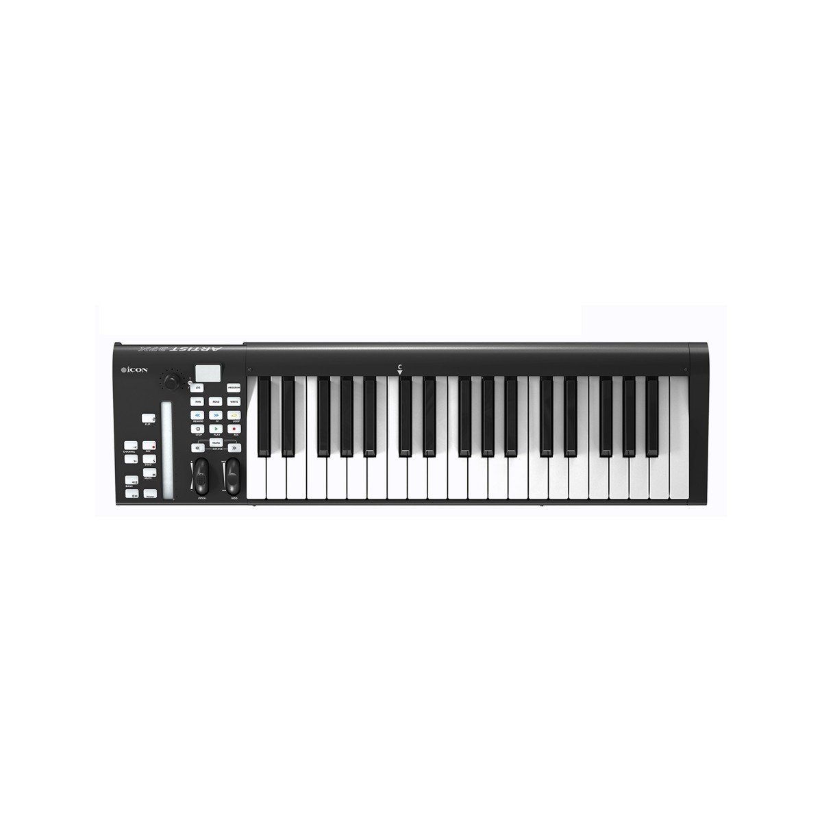 The slim-profile left-side control cluster ensures critical tools—dual-function encoder, pitch/mod wheels, and octave/transpose buttons—remain accessible without cluttering your workspace. Complemented by 18 assignable LED buttons and illuminated transport controls (Play, Stop, Rec, Rewind, Fast Forward and Loop), the Artist X puts essential functions at your fingertips.