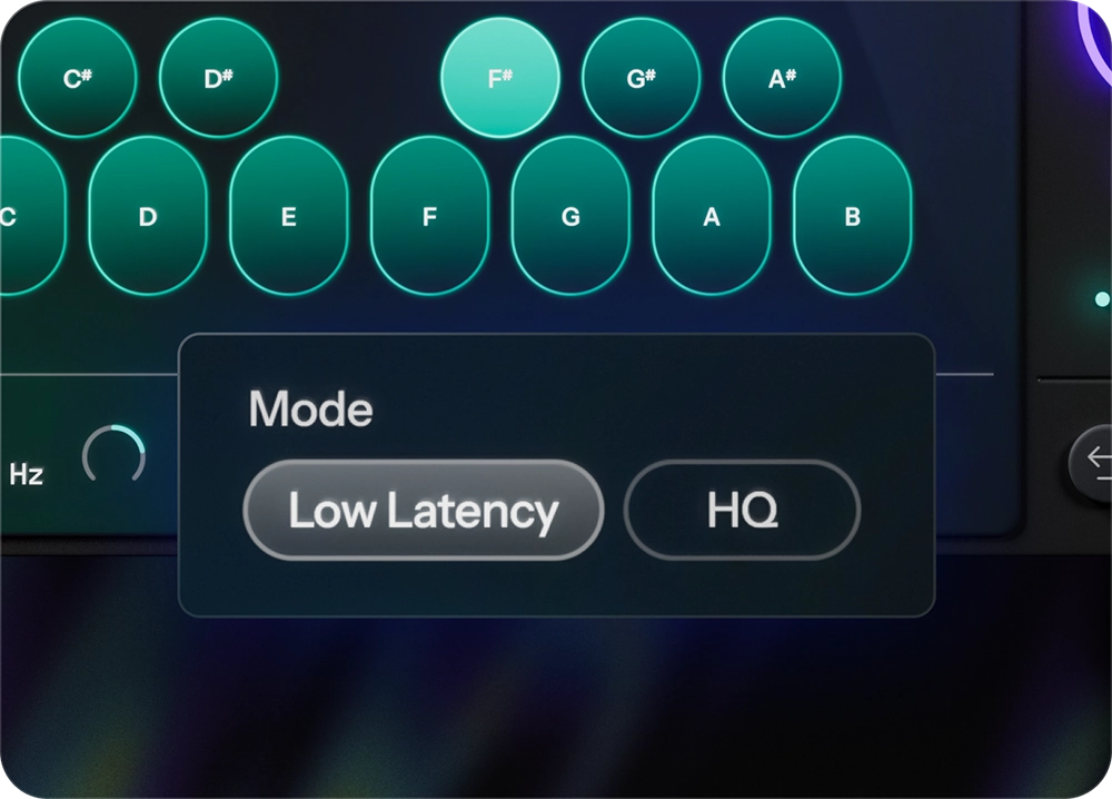 Instantly switch between Low Latency for live use or HQ (High Quality) for mix-ready fidelity. Seamless real-time processing keeps pace with your inspiration no matter what.