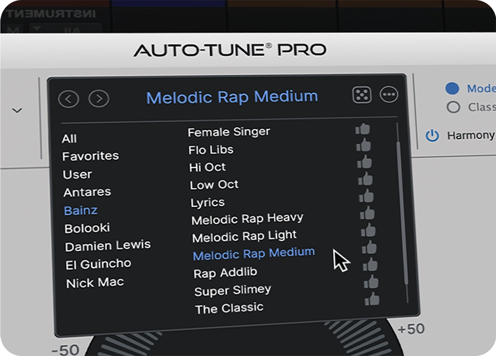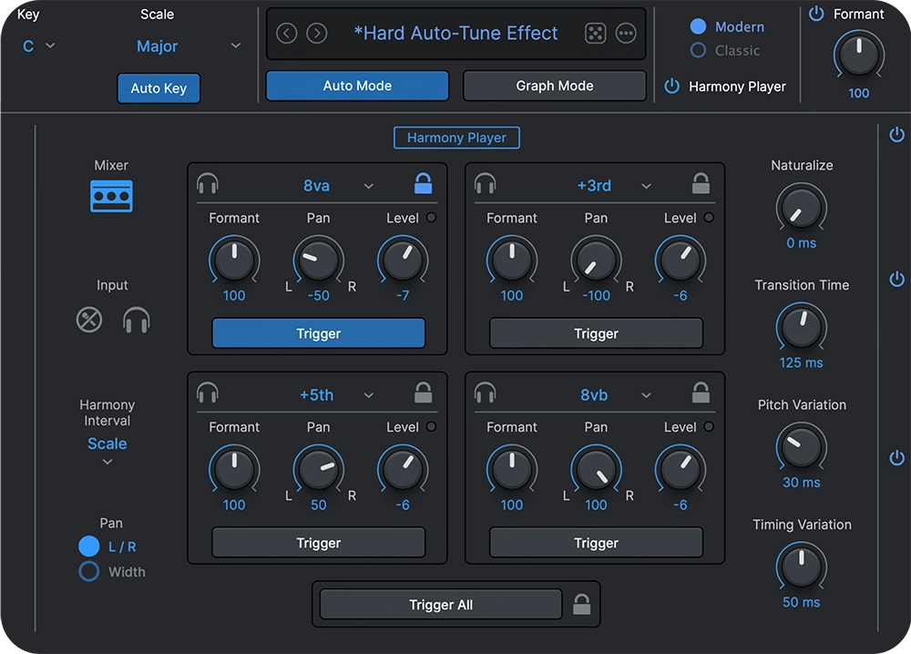 Powered by our famous Harmony Engine, AutoTune Pro 11’s Harmony Player unlocks four individual harmonies that can be mixed and MIDI-triggered for instrument-like playability. Crafting your perfect harmony is a breeze with user-friendly controls for formant, pan, and level. Master mix options include EQ, envelope, gate, and stereo width adjustments.