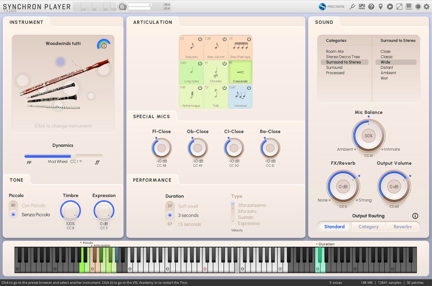 The Tutti Woodwinds patches unite all instruments of the woodwind family into one expressive ensemble – 13 players performing in unison and octaves, perfectly balanced to achieve a natural blend from the piercing brilliance of the piccolo to the deep resonance of the contrabassoon.