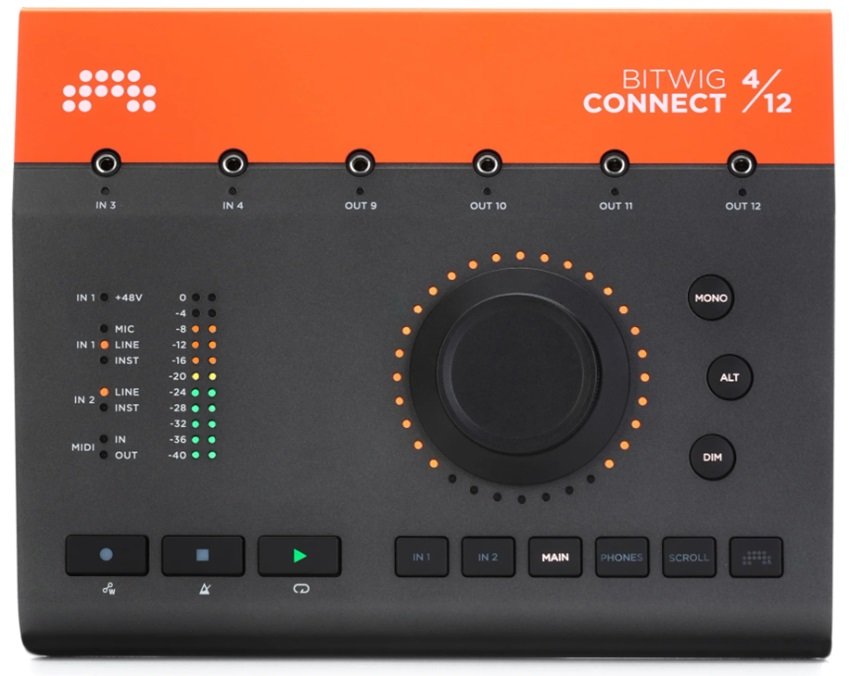 Bitwig Connect 4/12 is a class-compliant, 4‑in/12‑out CV- and MIDI‑enabled audio interface with monitor- and DAW-control functionalities and a unique Bitwig Mode.