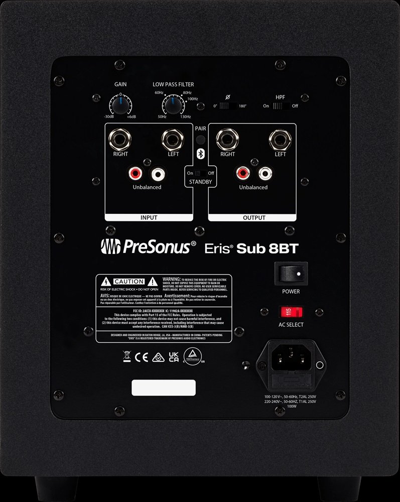 The first PreSonus® studio subwoofer to offer Bluetooth® 5.0 wireless connectivity, the Eris Sub 8BT provides flexible wired connection options, as well, making it easy to add it to just about any monitoring setup. Onboard controls let you effortlessly create a 2.1 monitoring system and tune it to your room. Highpass filter and lowpass filter (crossover) controls ensure the Eris Sub 8BT starts working at the precise frequency where your main monitors stop, avoiding the flabby, smudged, low-end mess that occurs without a crossover.
