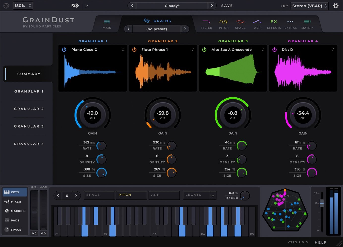 Animate your grains in space and time for constantly evolving sound.