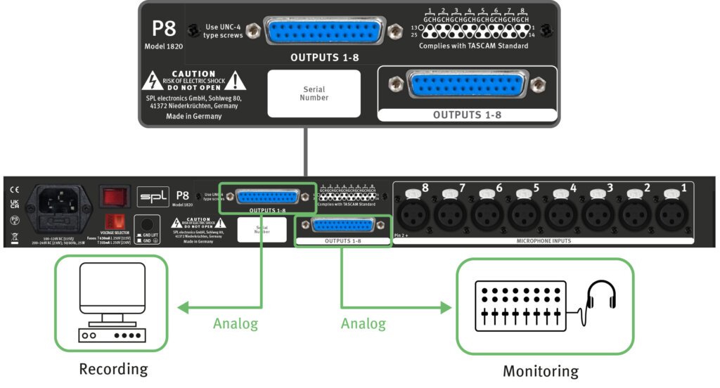 With the optional eight-channel ADAT converter, the purely analog P8 can be digitally connected to audio interfaces.