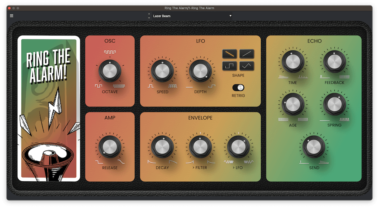 Customize your own unique Alarms with different LFO shapes, speeds, and an envelope that automates LFO-speed and the built-in low-pass filter. Then add finishing touches with the effects section.