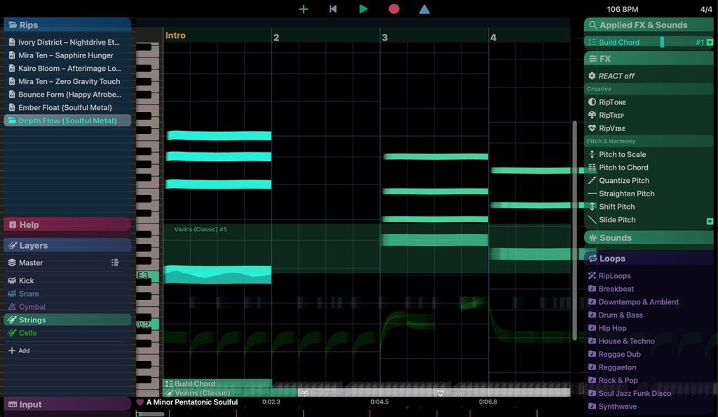 Seamlessly mix, experiment, and create with RipX DAW. Combine your favorite parts, then easily adjust tempo, pitch, key/scale, effects, time-stretch, stereo panning (even on mono tracks), volume, and EQ. Craft loops and edit them in real-time for instant new music. Plus, copy and paste parts between tracks with automatic tempo matching.