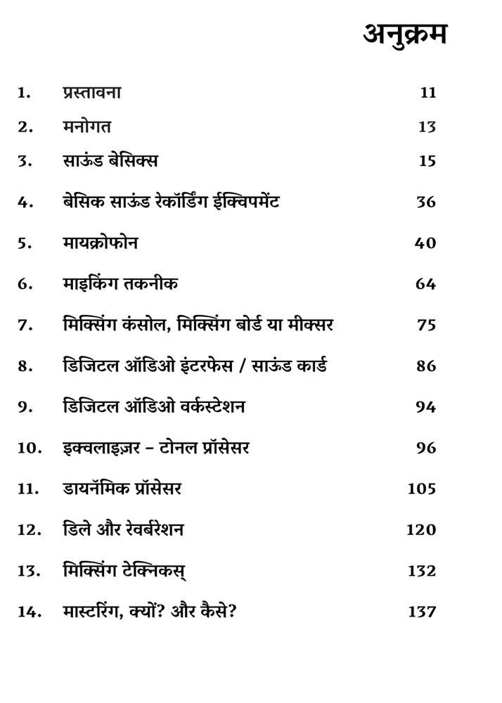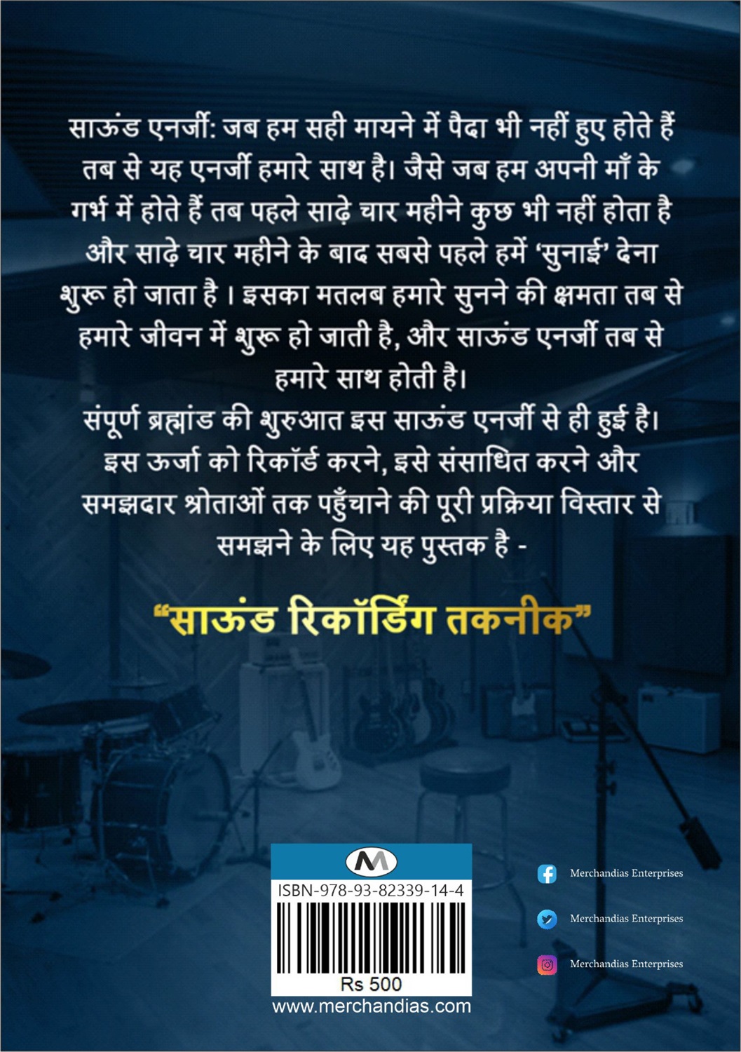 This is not a conventional textbook; where we have a target audience in mind and therefore stick to a particular academic level, साउंड रिकॉर्डिंग तकनीक is a curated masterclass. It is a kind of reference you return to throughout your career; whether you are a student of sound engineering, struggler in the field or established engineer/designer, there are writings in this book which will appeal to you.