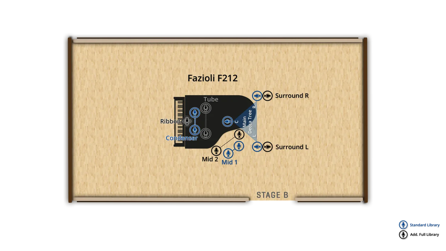 To capture this marvelous instrument on Stage B, our recording engineers used multiple high-end microphone arrays, providing an abundance of options for creating your individual sound. The Full Library features three different sets of close microphones with condenser, ribbon, and tube options, two pairs of mid mics, as well as the Decca tree with additional surround outriggers.