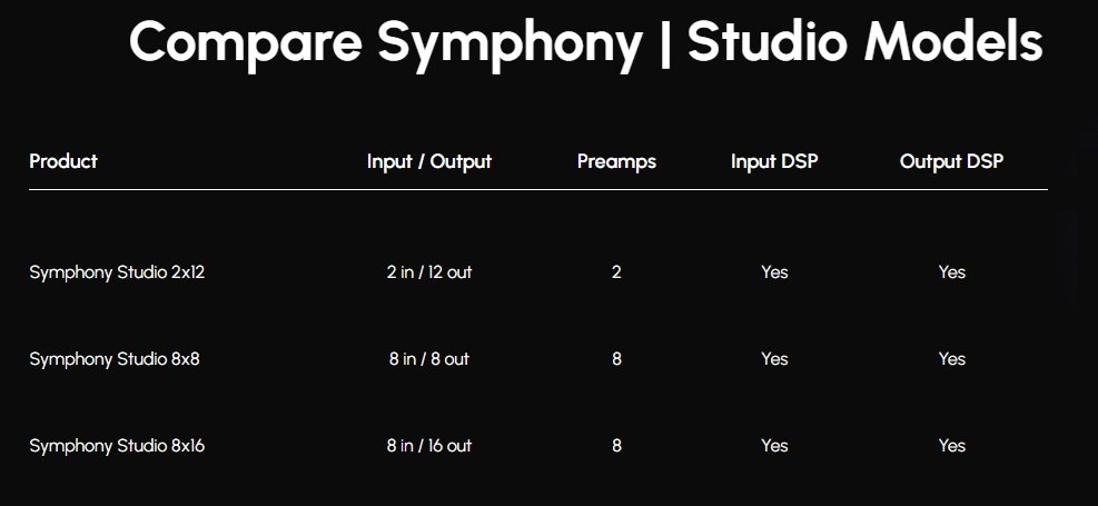 The Symphony Studio Series achieves the same sonic aesthetics and measurable spec as the first generation Symphony MK II cards such as the 16x16S2 and 8x8S2. While the analog signal path and components differ, the Symphony Studio Series also performs on par with the Symphony Desktop while providing larger IO counts. The Symphony MK II Special Edition provides superior audio performance and thus is not comparable.