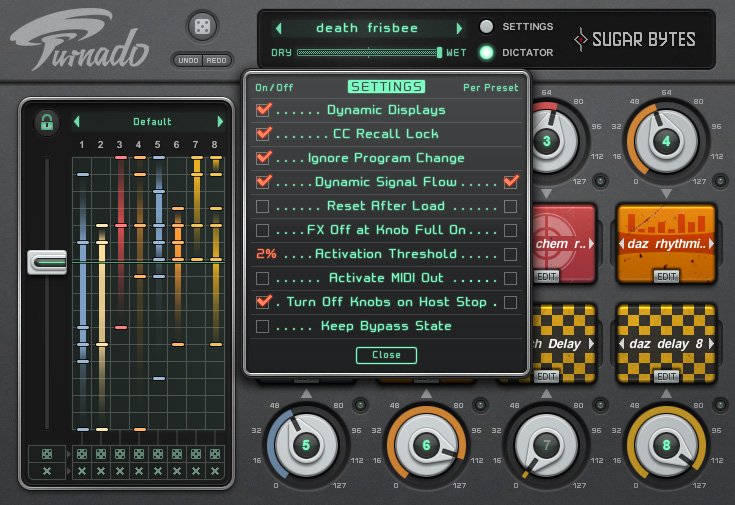 Keep it simple! Turnado comes with 8 knobs, each firing up an effect and varying it with their dial. It invites play and experimentation with one or several effects. Customize 24 effects in expert mode. If you want it even more compact: in Dictator Mode, you can control all 8 effects simultaneously with a single fader.