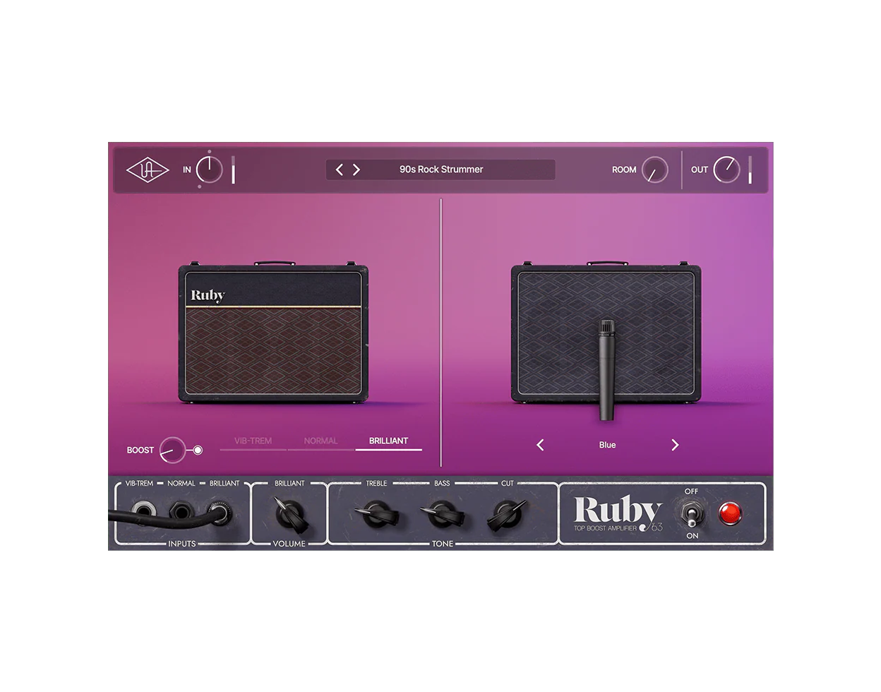 The UAD Ruby ‘63 plug-in gives you the inspiring, album‑ready tone of an expertly miked “golden unit” Top Boost amp, within seconds. Based on the award-winning UAFX pedal, you get all the controls that make this amp a must-have for recording pop, rock, metal, country, and more.