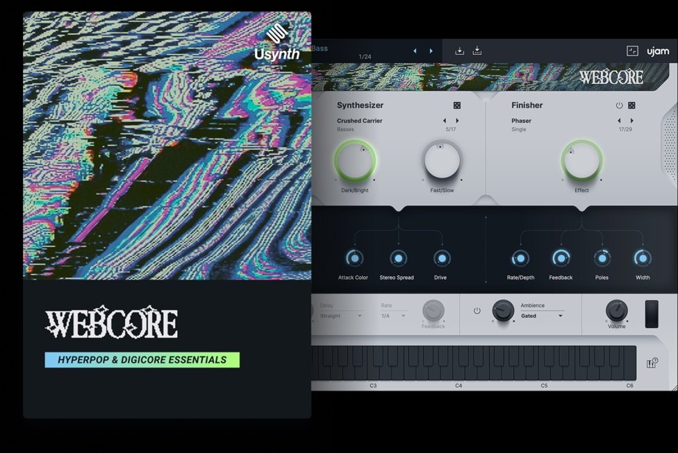 WEBCORE is a playful, glitchy Usynth for chaotic modern genres like Glitch Pop, Hyperpop, Digicore, and Botanica. Its sounds are proudly synthetic — metallic, clean, and digital rather than acoustic or retro. WEBCORE is the perfect stylistic companion to Beatmaker CHROMED.