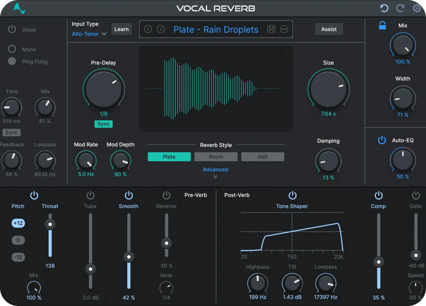 Vocal Reverb by AutoTune is a groundbreaking vocal-dedicated reverb plug-in featuring advanced AI Assist technology, Auto-EQ with patented AutoTune Pitch Tracking, three versatile reverb algorithms (Hall, Plate, Room), and two dynamic delay types (Mono and Stereo Ping Pong). With over ten pre and post-verb effects, including exclusive Auto-EQ to maintain vocal clarity, Vocal Reverb offers a comprehensive solution for professional vocal production, allowing users to effortlessly add ambiance, depth, and emotional impact to their recordings.